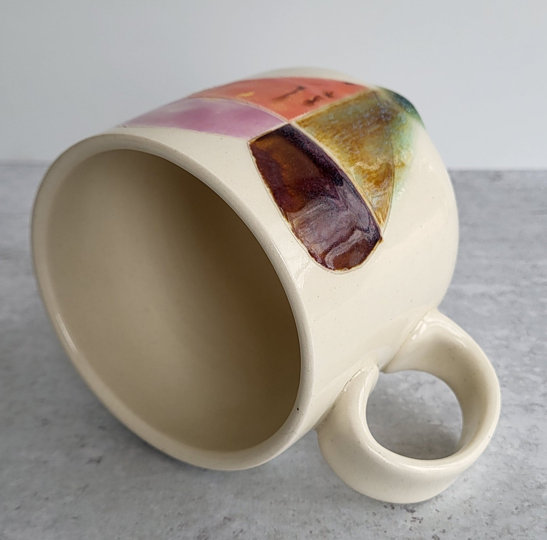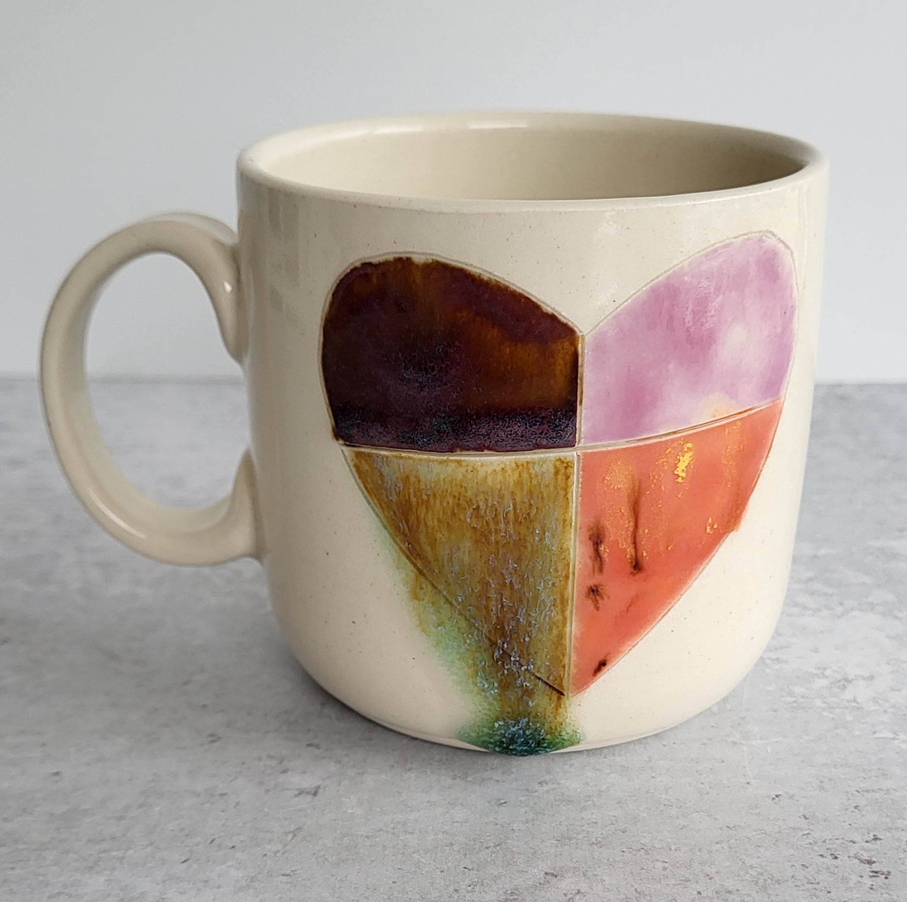 14 oz Mug. Drippy heart decoration on one side. Food safe, dishwasher safe. Price reflects a single mug.