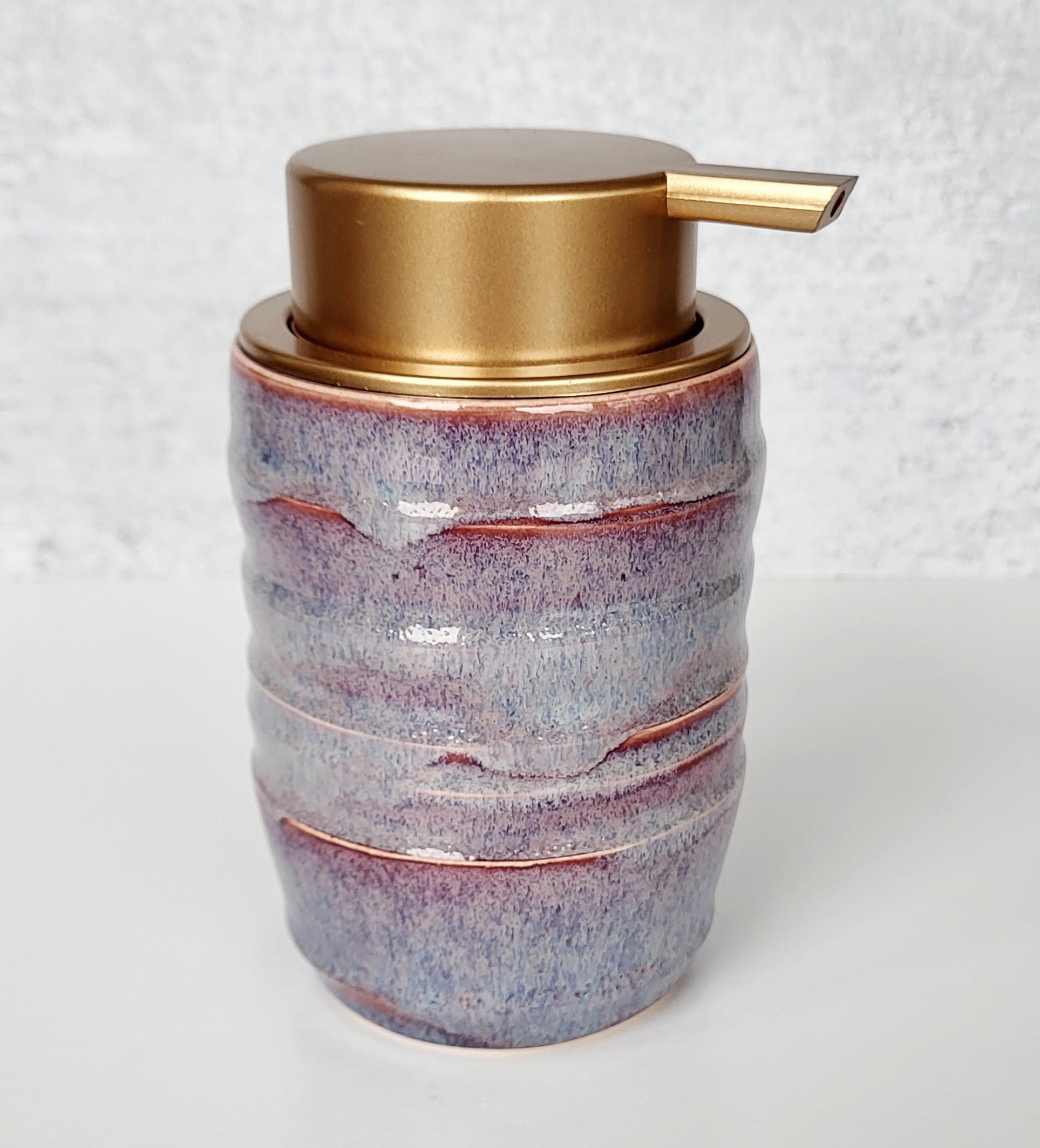 Glazed stoneware. Holds approximately 14 oz of liquid soap. Soap not included. Tray sold separately. Price reflects the cost for one container and pump. 3" W x 5" H.