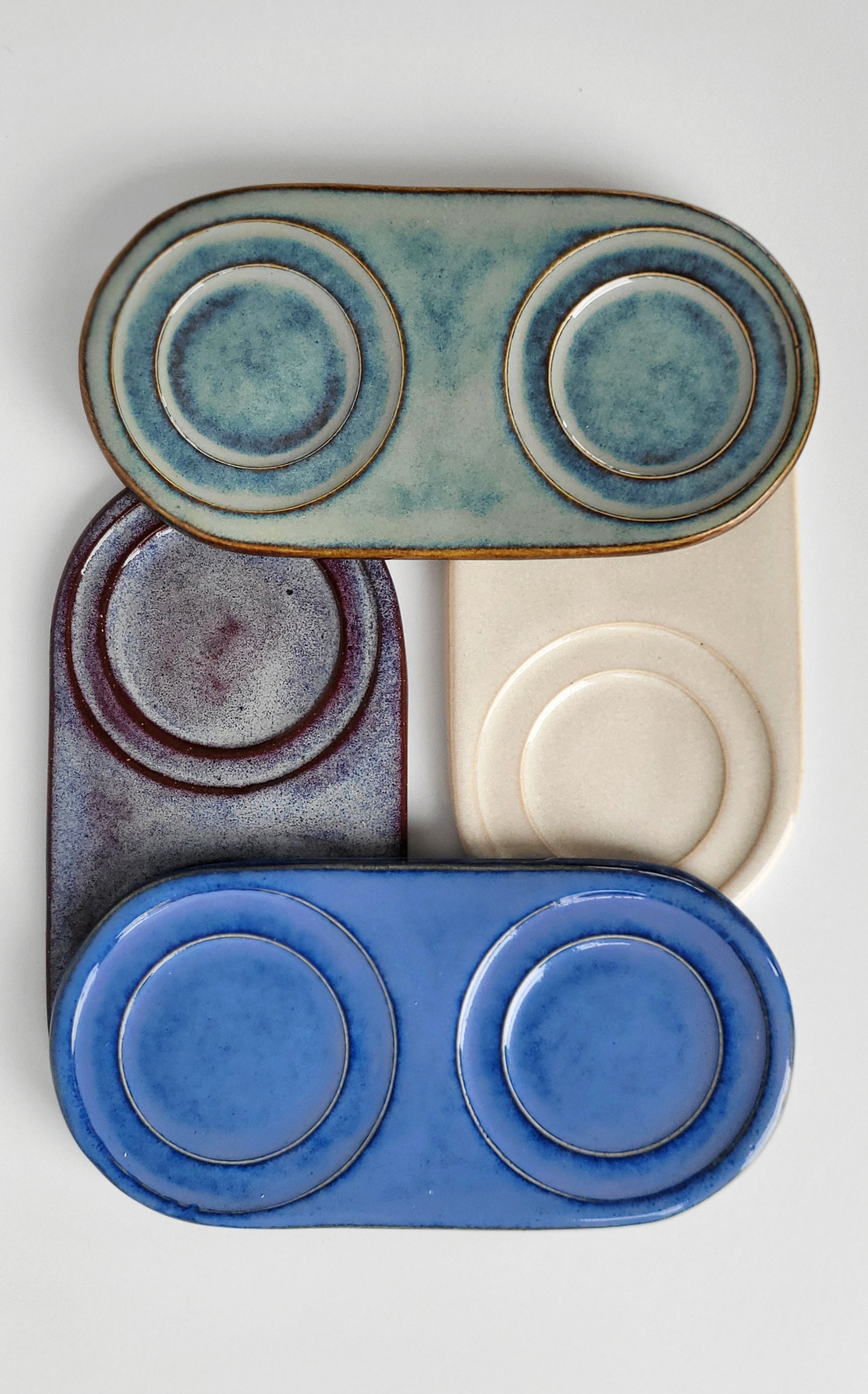 Glazed stoneware. Great solo or to pair with soap dispenser, salt/pepper, espresso cups, etc. Price reflects cost for one tray. 8.25" x 4" x .375"